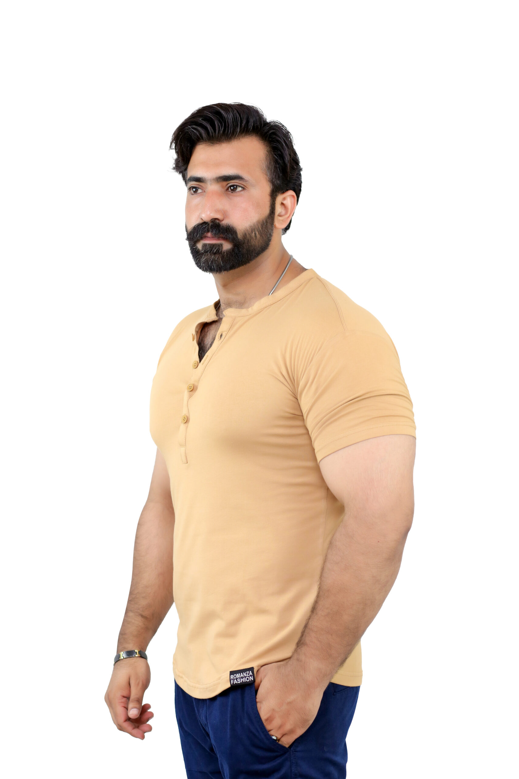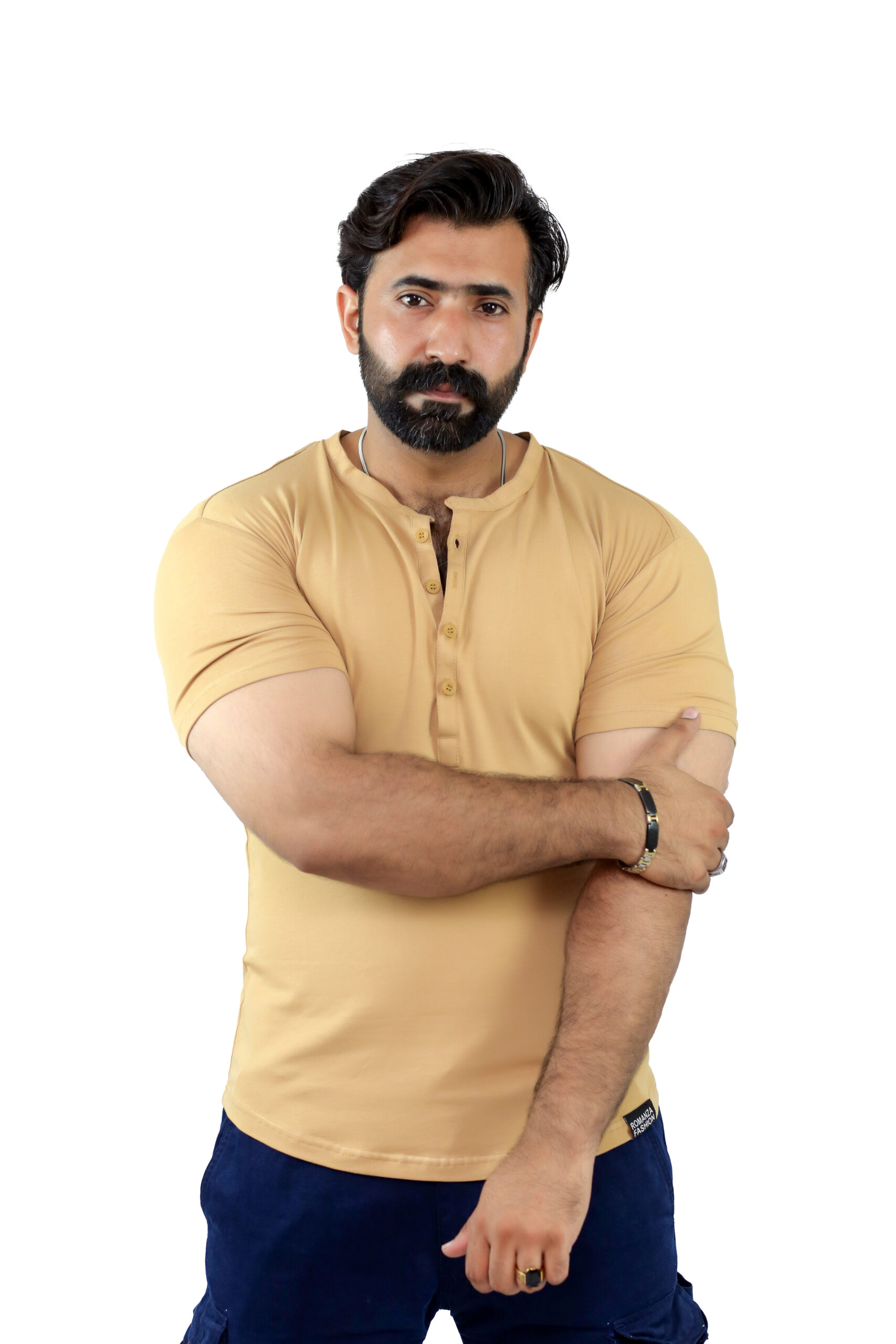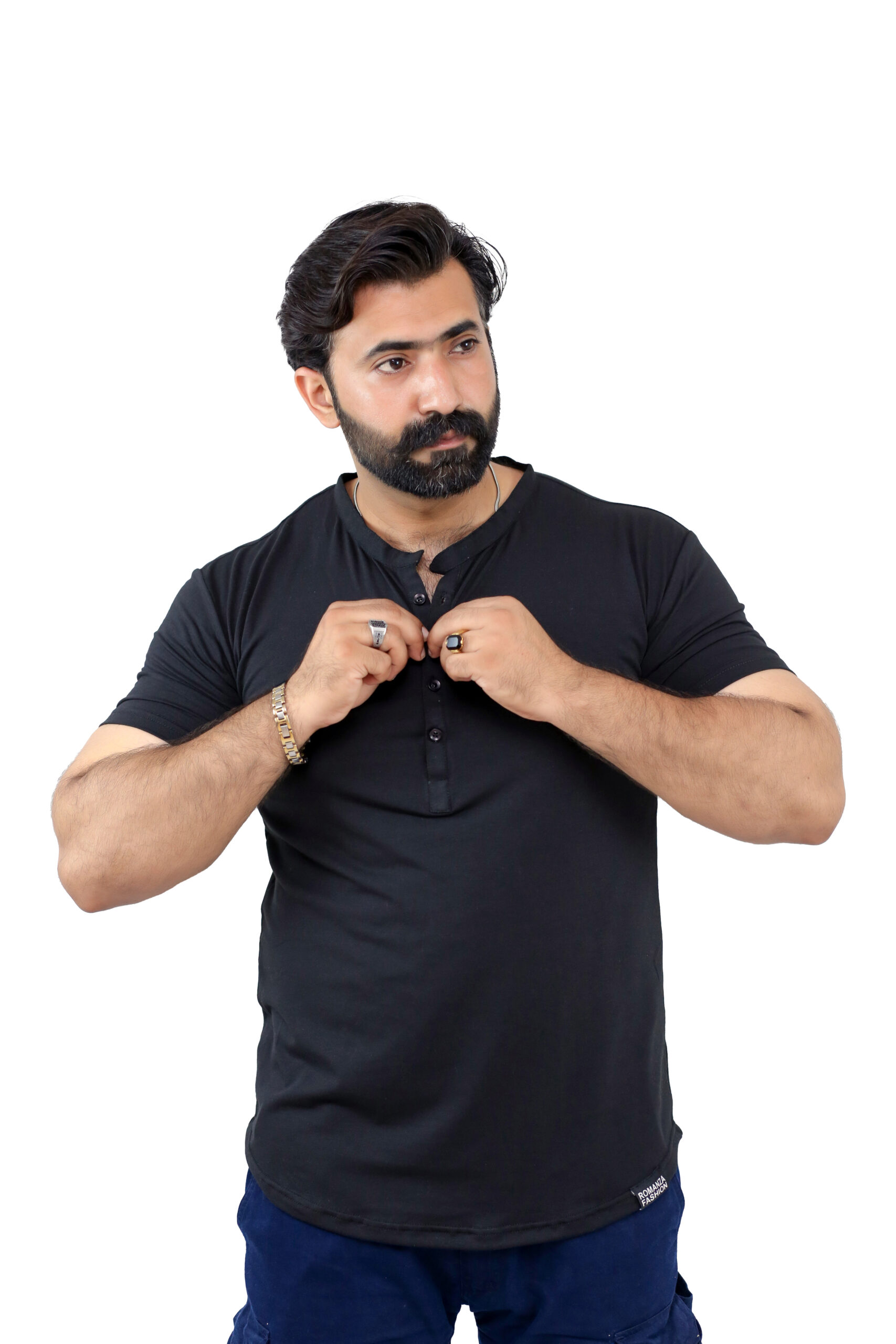 Elevate your casual wardrobe with this thoughtfully designed T-shirt crafted from a premium blend of 95% cotton and 5% spandex, offering a perfect balance of natural comfort, breathability, and flexible movement. Designed for both style and practicality, this T-shirt features a sleek front button strip and a minimalist band collar (ban collar) for a modern, clean look.